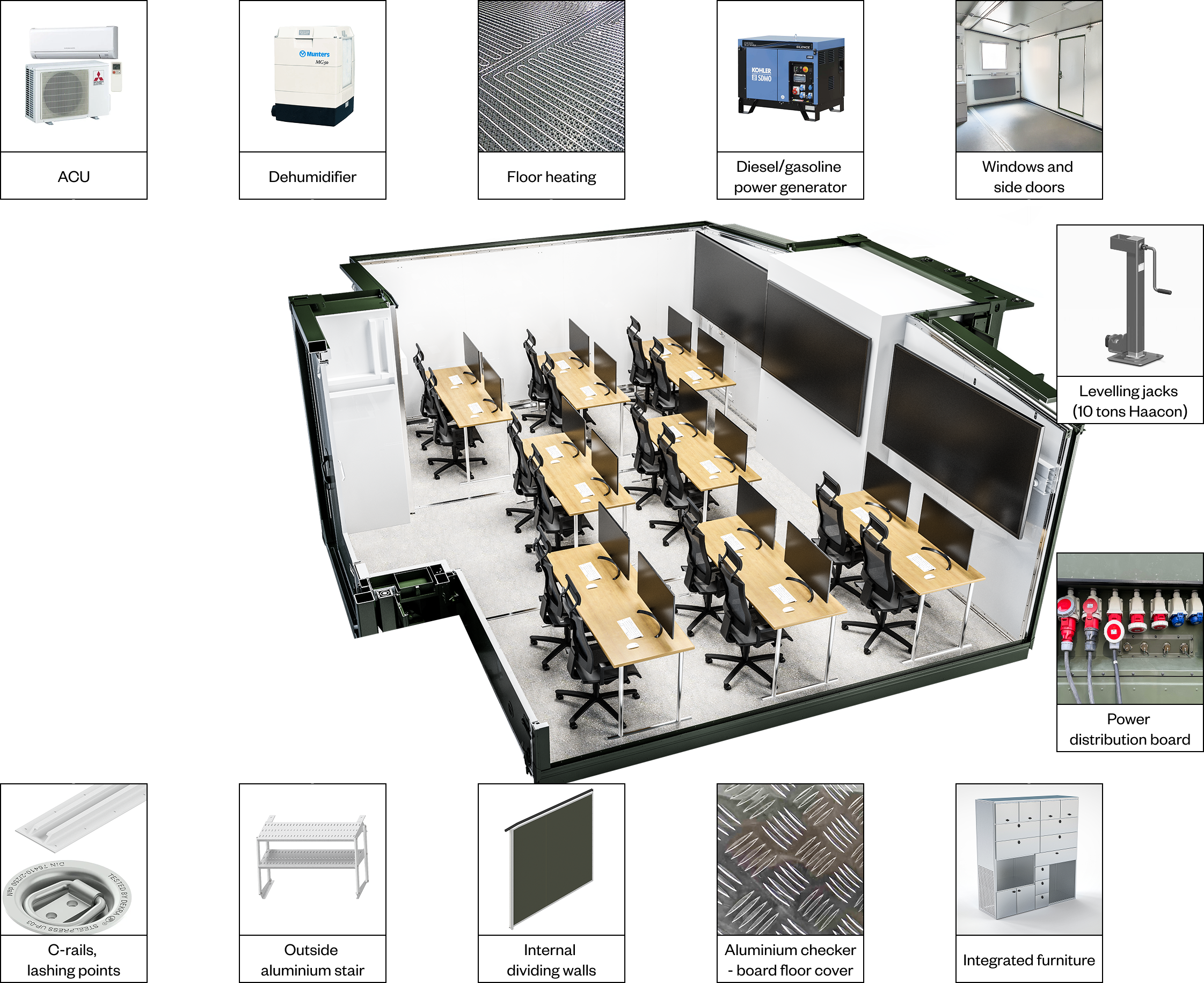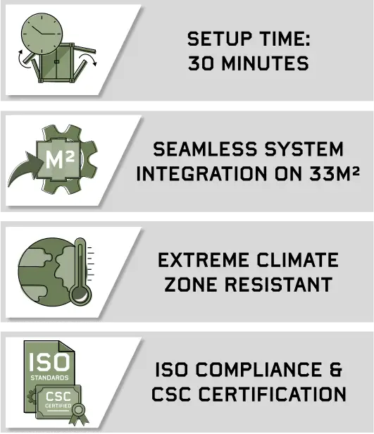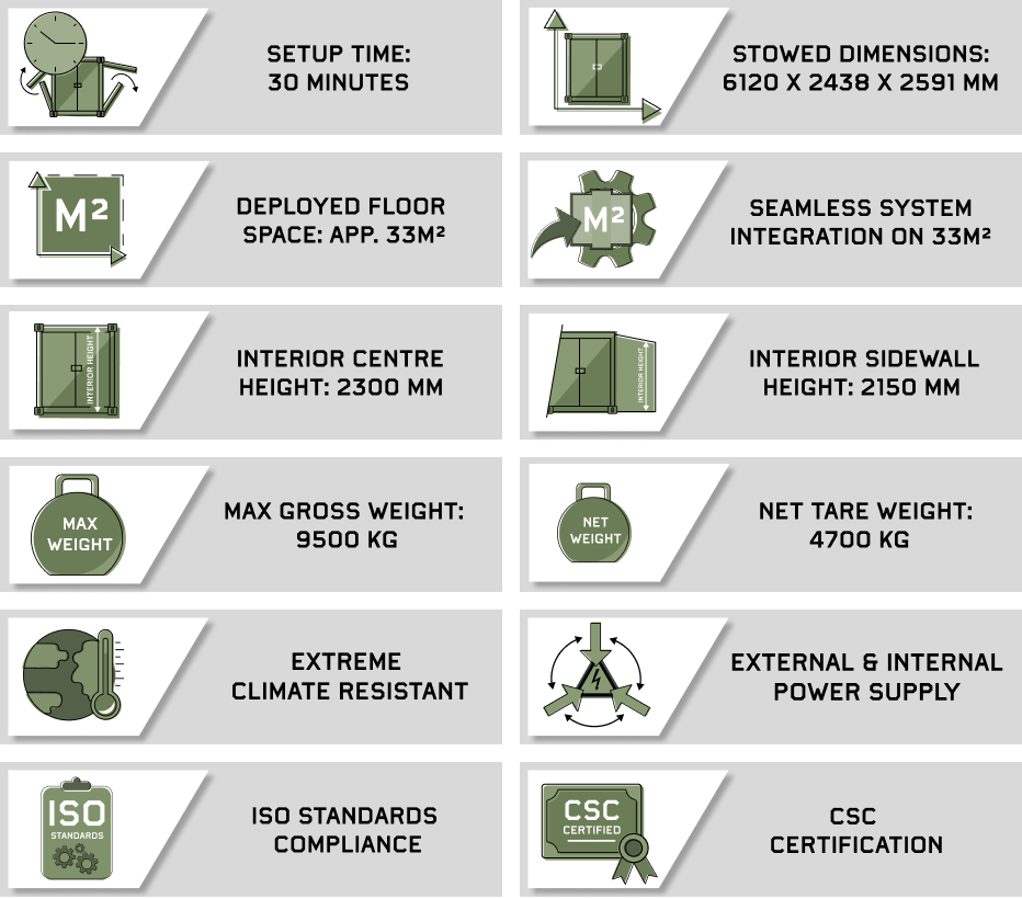 The shelter enables quick deployment, efficient space use, and reliable performance in extreme conditions. It meets ISO and CSC standards, featuring a durable structure suitable for high and low temperatures. With practical interior height, integrated systems, and balanced weight, it ensures smooth transport and setup. Its versatility fits mission-critical use across civilian and military applications. Built to support a range of configurations and roles, it provides a dependable environment wherever mobility and readiness are needed.
