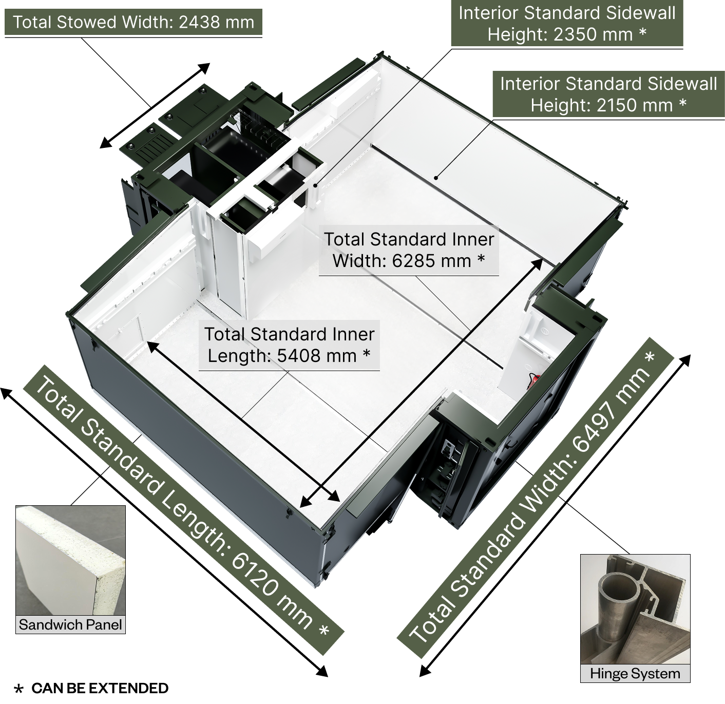 Expandable design provides up to 33 m² usable space in 30 minutes.