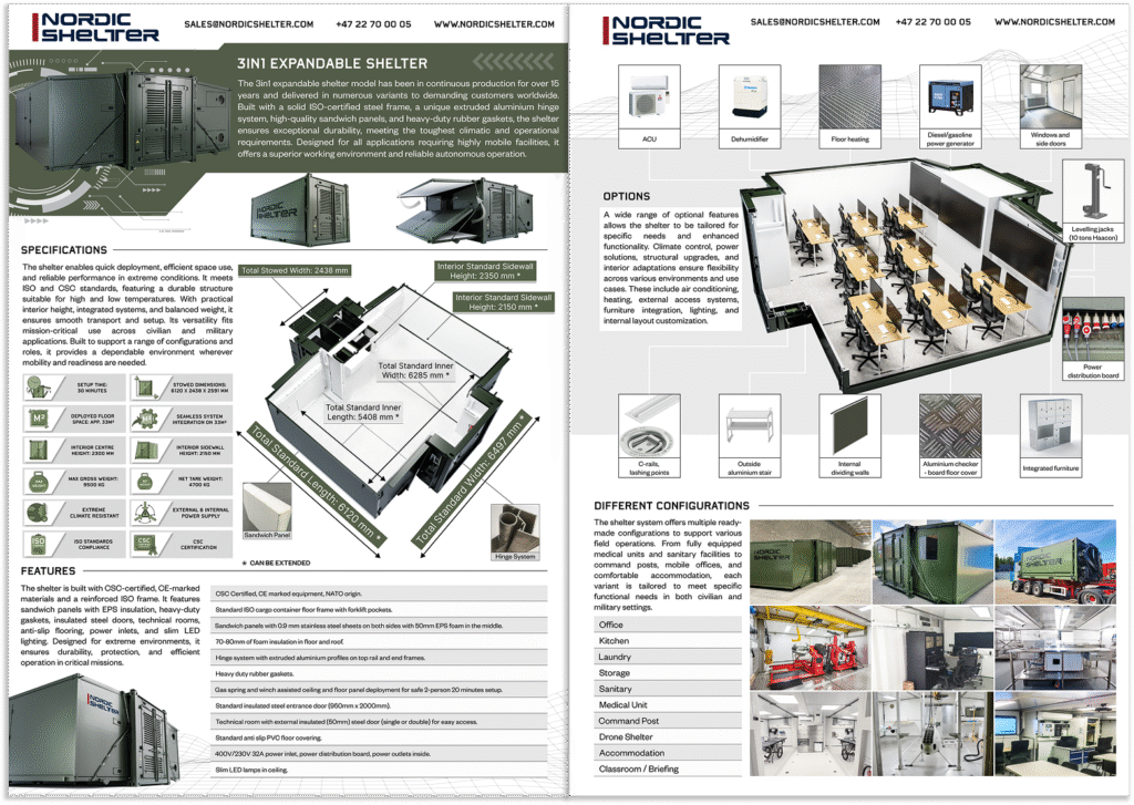 The 3in1 expandable shelter model has been in continuous production for over 15 years and delivered in numerous variants to demanding customers worldwide. Built with a solid ISO-certified steel frame, a unique extruded aluminium hinge system, high-quality sandwich panels, and heavy-duty rubber gaskets, the shelter ensures exceptional durability, meeting the toughest climatic and operational requirements. Designed for all applications requiring highly mobile facilities, it offers a superior working environment and reliable autonomous operation.