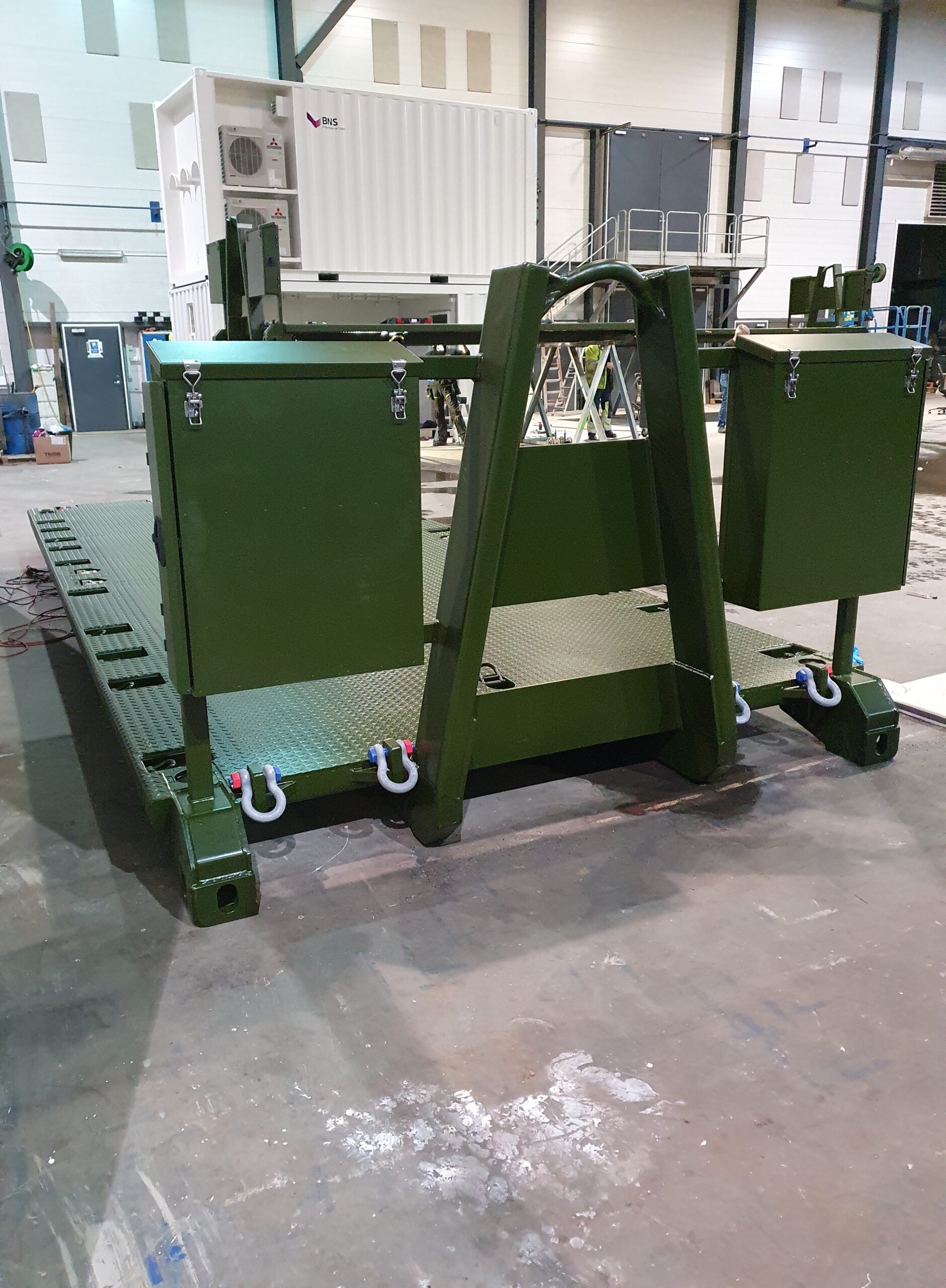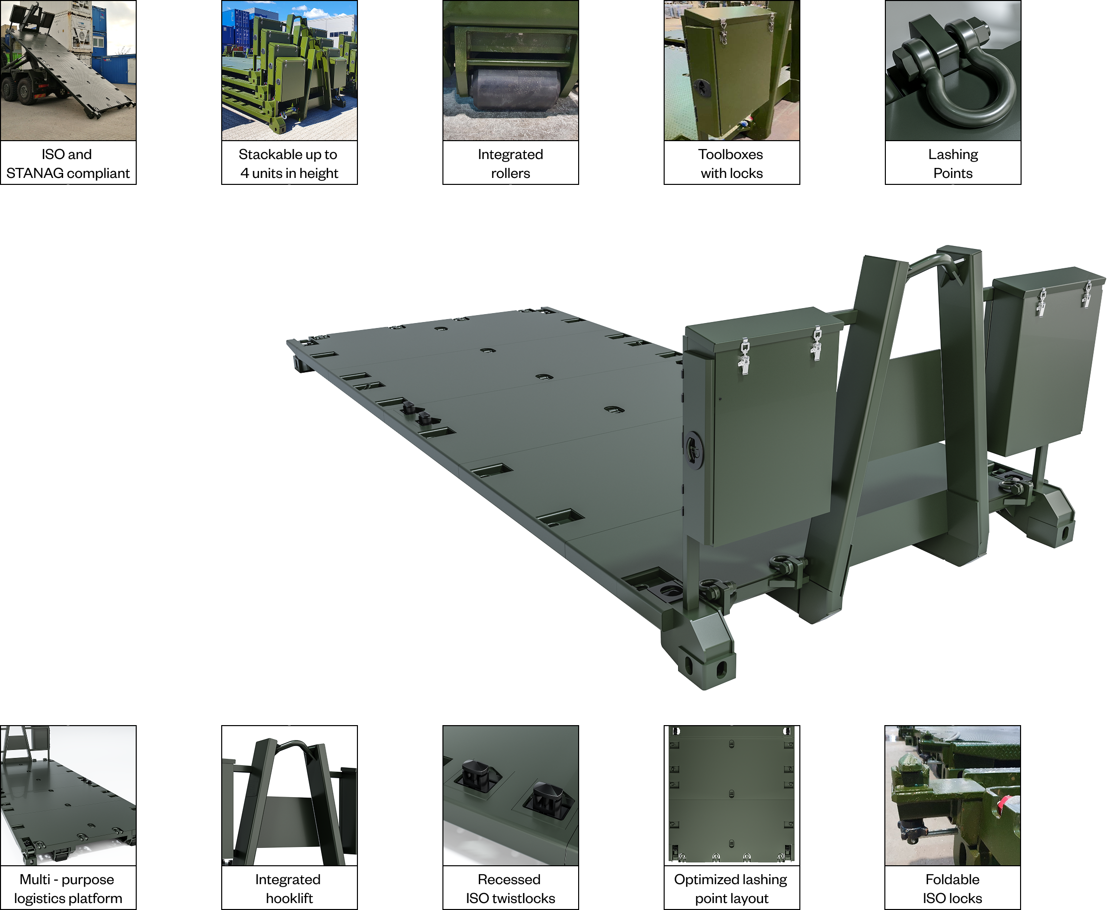 The flatrack is fully compliant with ISO and STANAG standards, featuring foldable ISO locks, reinforced lashing points, and front-mounted toolboxes for functionality. It is designed to transport one 20-foot container or two 10-foot containers and allows lashing points to be adapted to customer needs. The structure is insulated with sandwich panels and stainless steel sheets, ensuring durability and flexibility in operations.