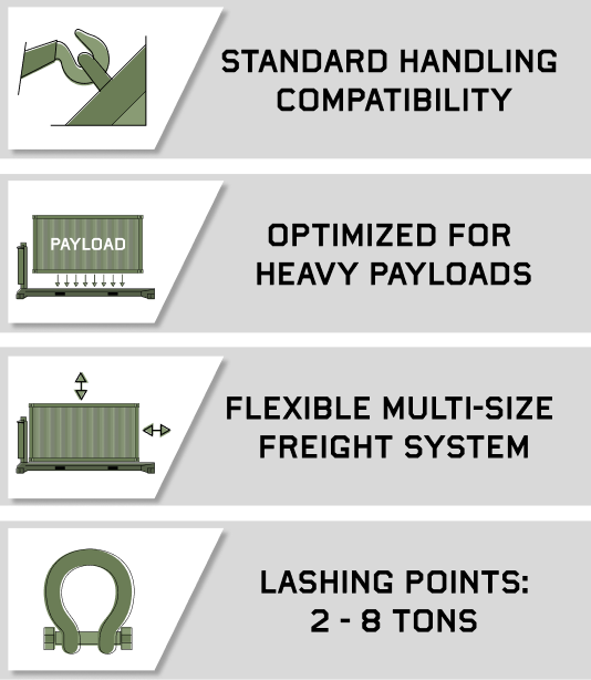 Provides a stable and adaptable platform for containers, equipment, pallets and mission loads in various operational scenarios
