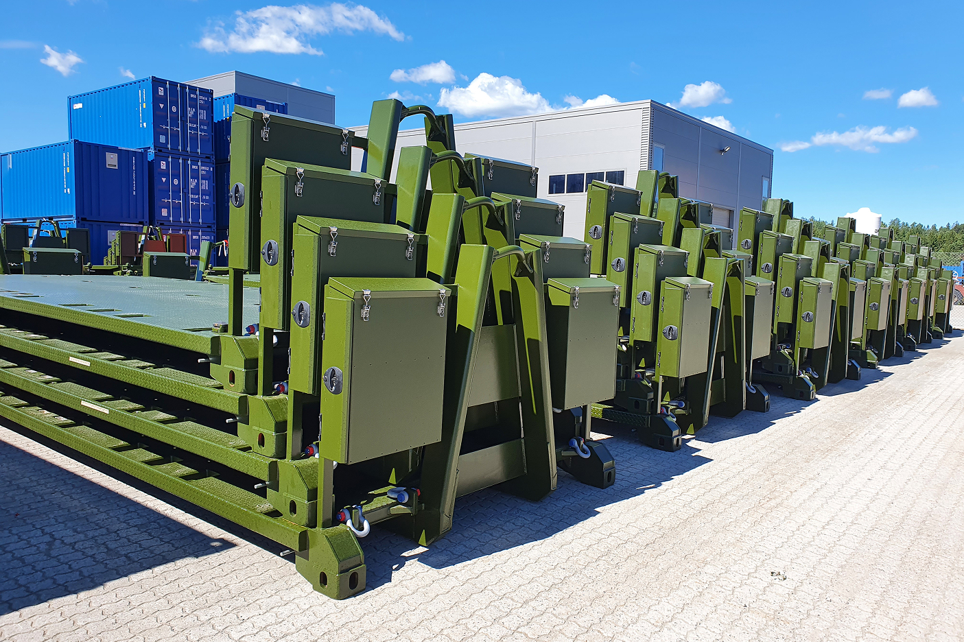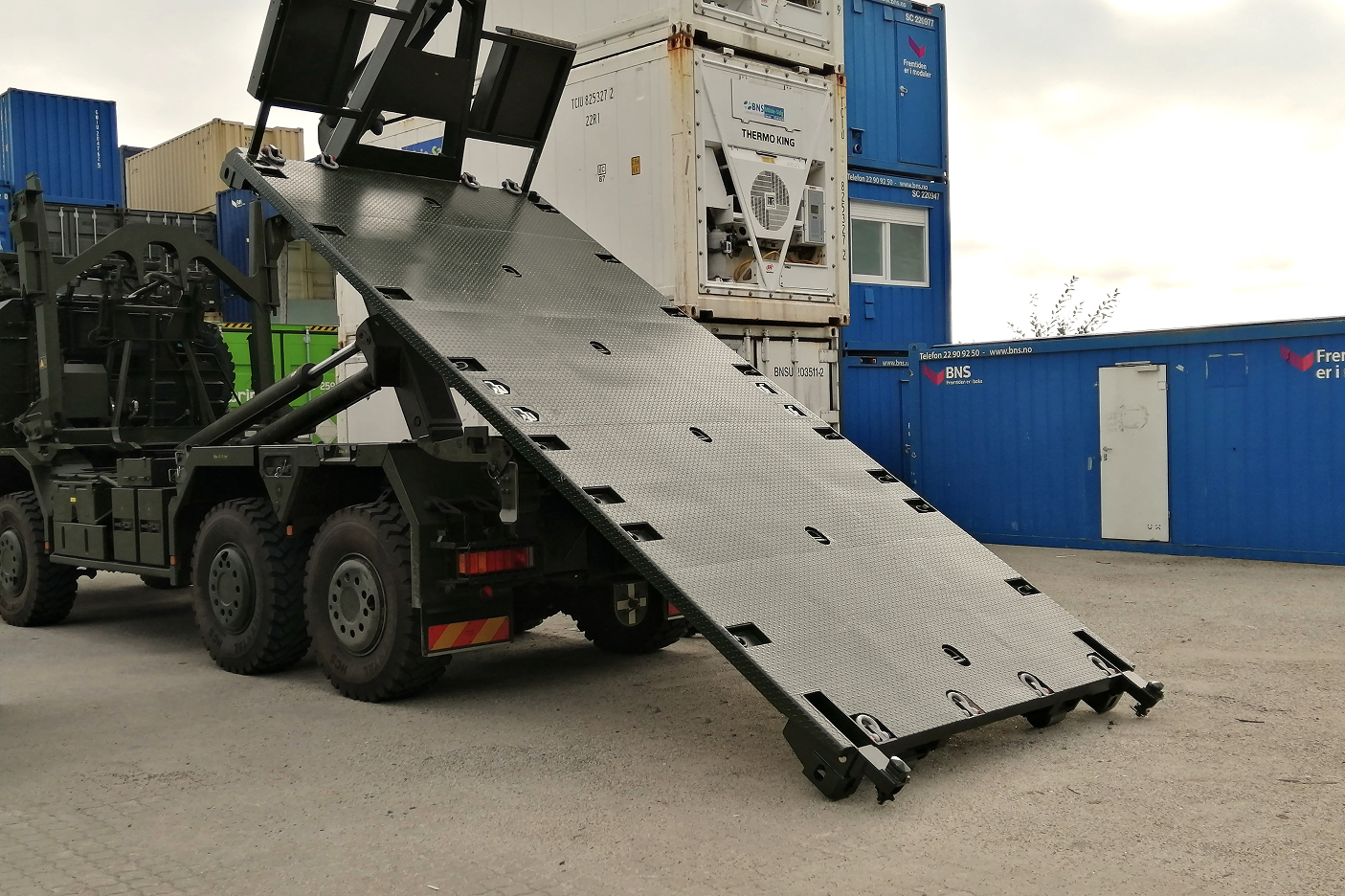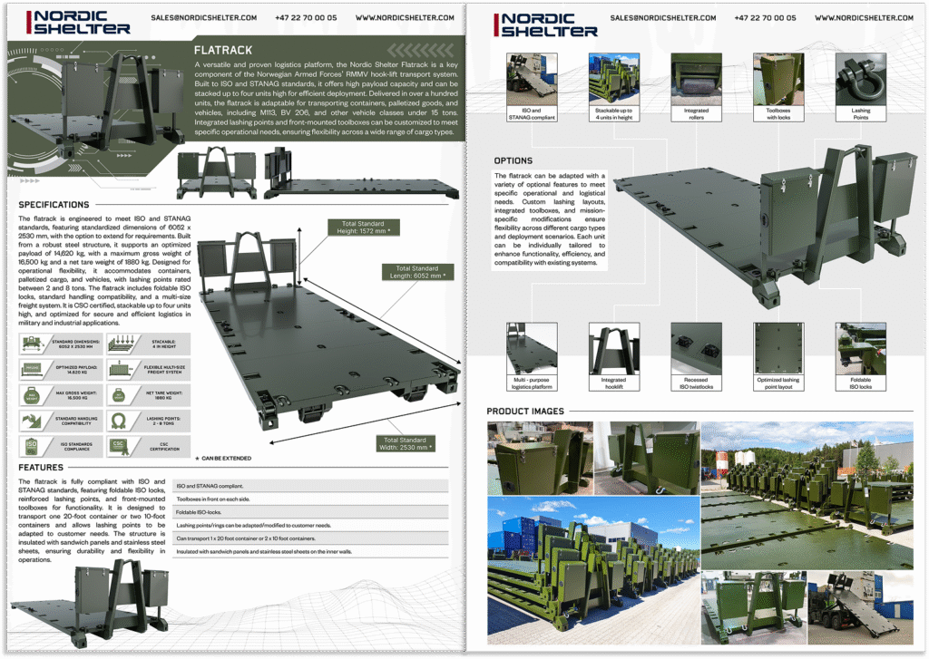 A versatile and proven logistics platform, the Nordic Shelter Flatrack is a key component of the Norwegian Armed Forces’ RMMV hook-lift transport system. Built to ISO and STANAG standards, it offers high payload capacity and can be stacked up to four units high for efficient deployment. Delivered in over a hundred units, the flatrack is adaptable for transporting containers, palletized goods, and vehicles, including M113, BV 206, and other vehicle classes under 15 tons. Integrated lashing points and front-mounted toolboxes can be customized to meet specific operational needs, ensuring flexibility across a wide range of cargo types.