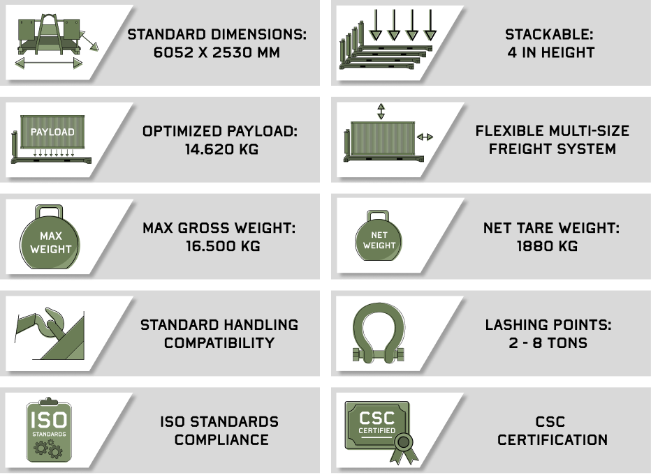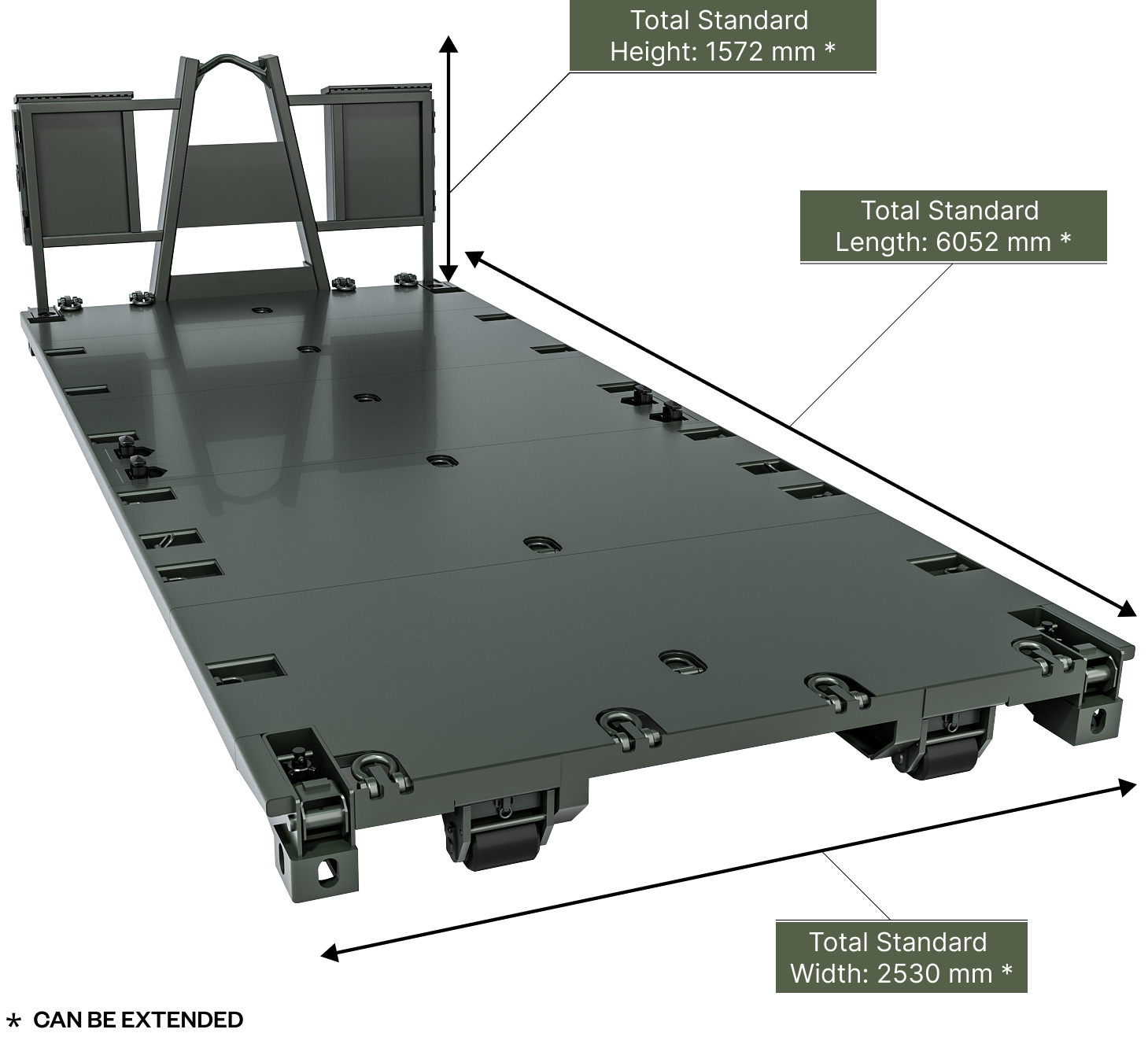 The flatrack is engineered to meet ISO and STANAG standards, featuring standardized dimensions of 6052 x 2530 mm, with the option to extend for requirements. Built from a robust steel structure, it supports an optimized payload of 14,620 kg, with a maximum gross weight of 16,500 kg and a net tare weight of 1880 kg. Designed for operational flexibility, it accommodates containers, palletized cargo, and vehicles, with lashing points rated between 2 and 8 tons. The flatrack includes foldable ISO locks, standard handling compatibility, and a multi-size freight system. It is CSC certified, stackable up to four units high, and optimized for secure and efficient logistics in military and industrial applications.