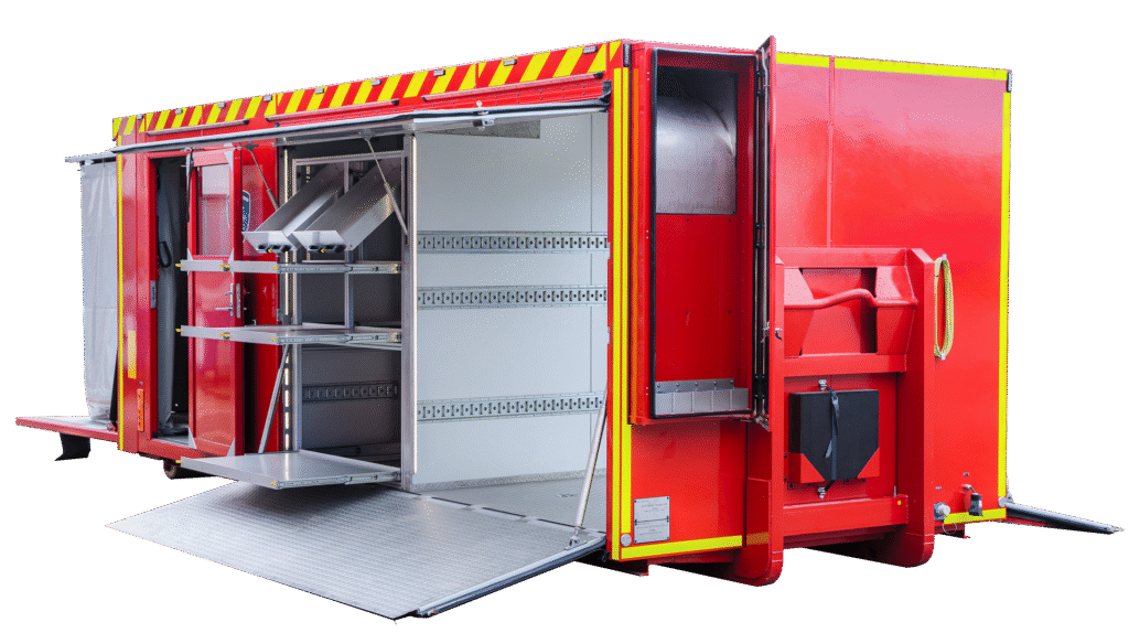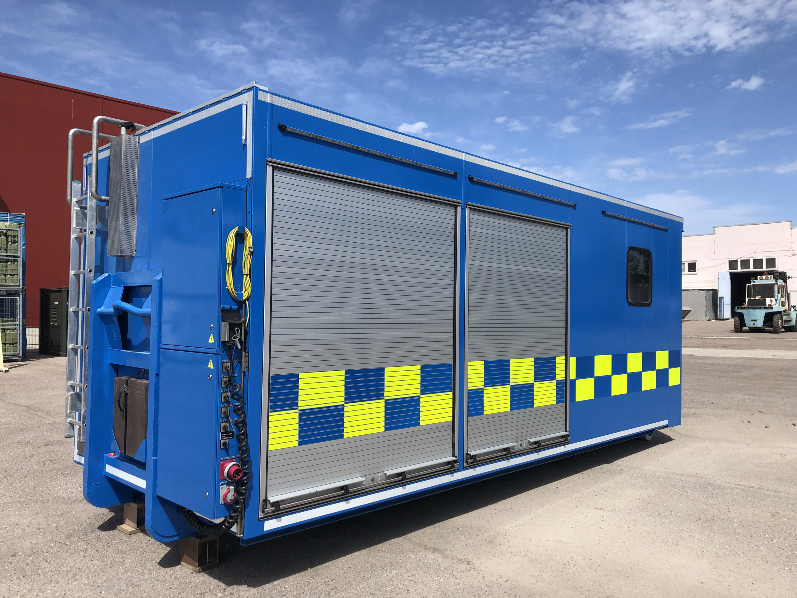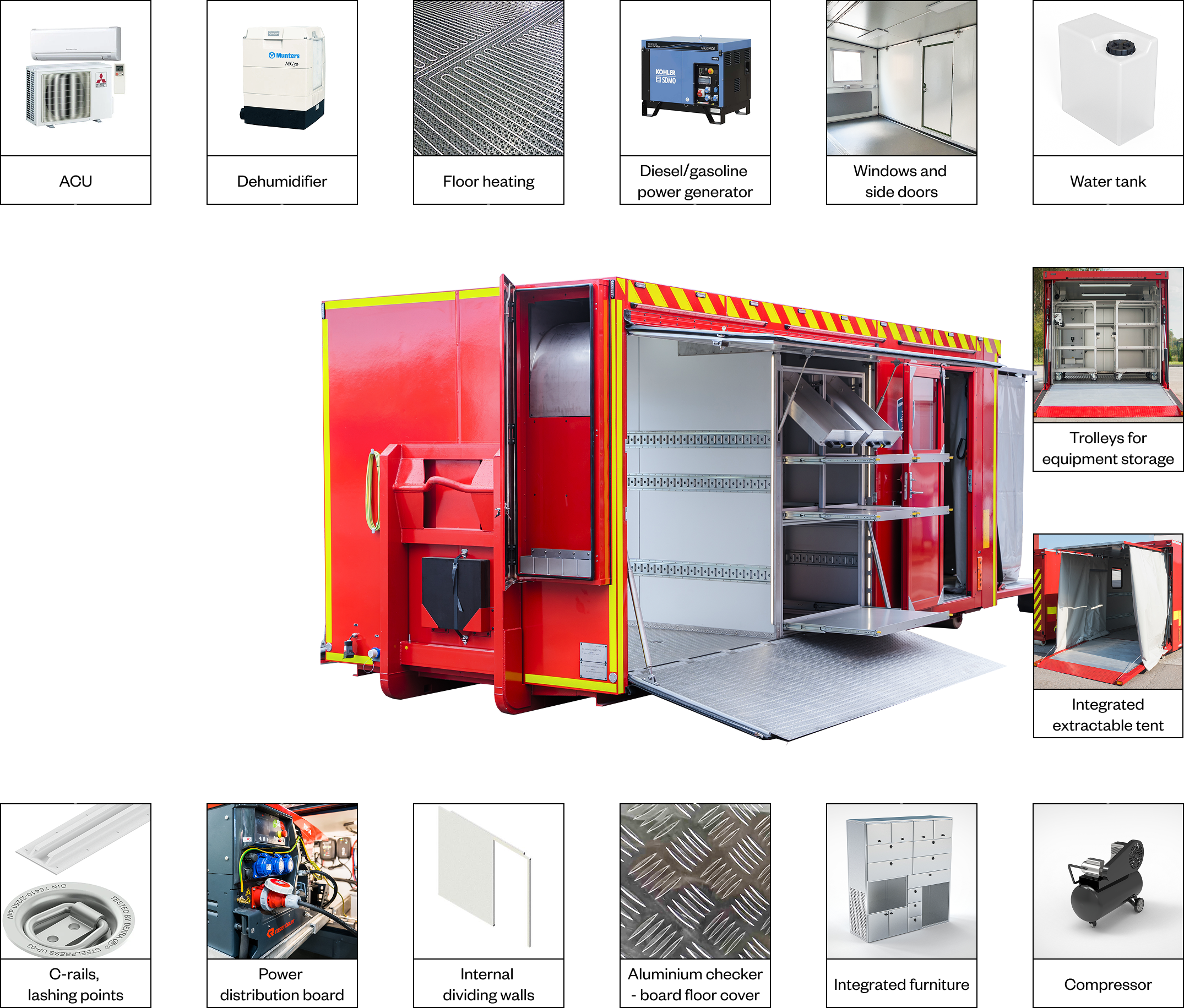 The lightweight shelter is built on a lightweight hooklift frame according to the Swedish SS3021 standard, using high-strength steel combined with insulated sandwich panels and aluminium sheets for enhanced durability and thermal protection. A hydraulic ramp at the rear enables efficient loading and unloading. The shelter integrates a flexible electrical system for field operations, supported by a 24 VDC battery for autonomous deployment and reliable startup. Multiple configurations are available, tailored for rescue services, CBRN incident response, urban search and rescue, and specialized police bomb squads.
