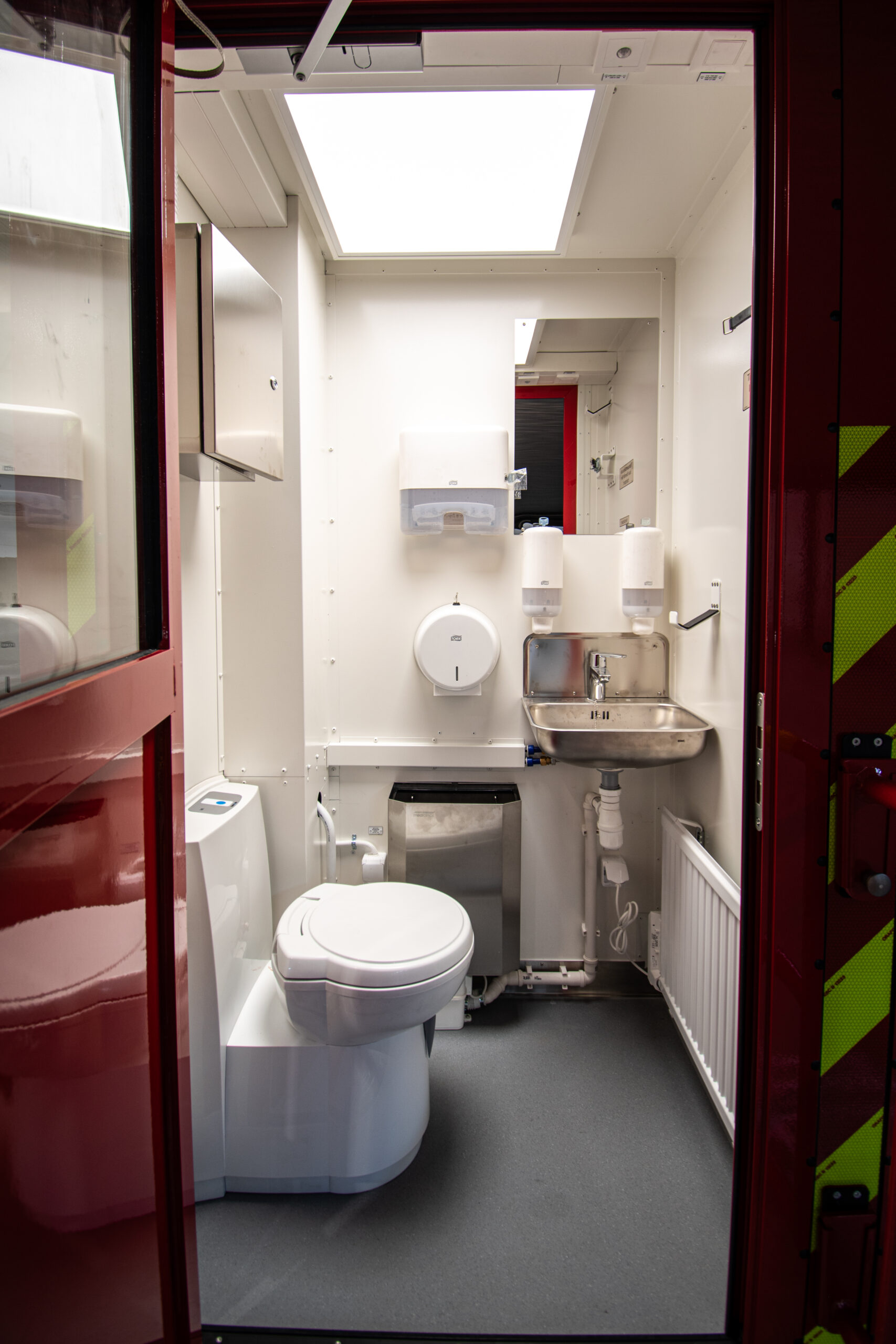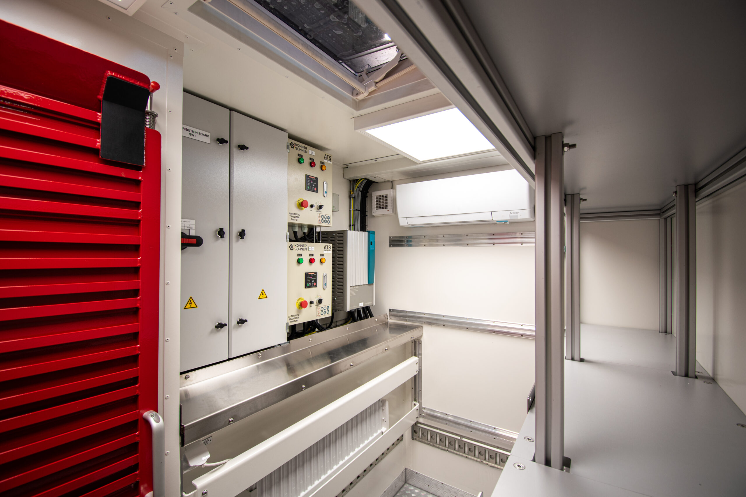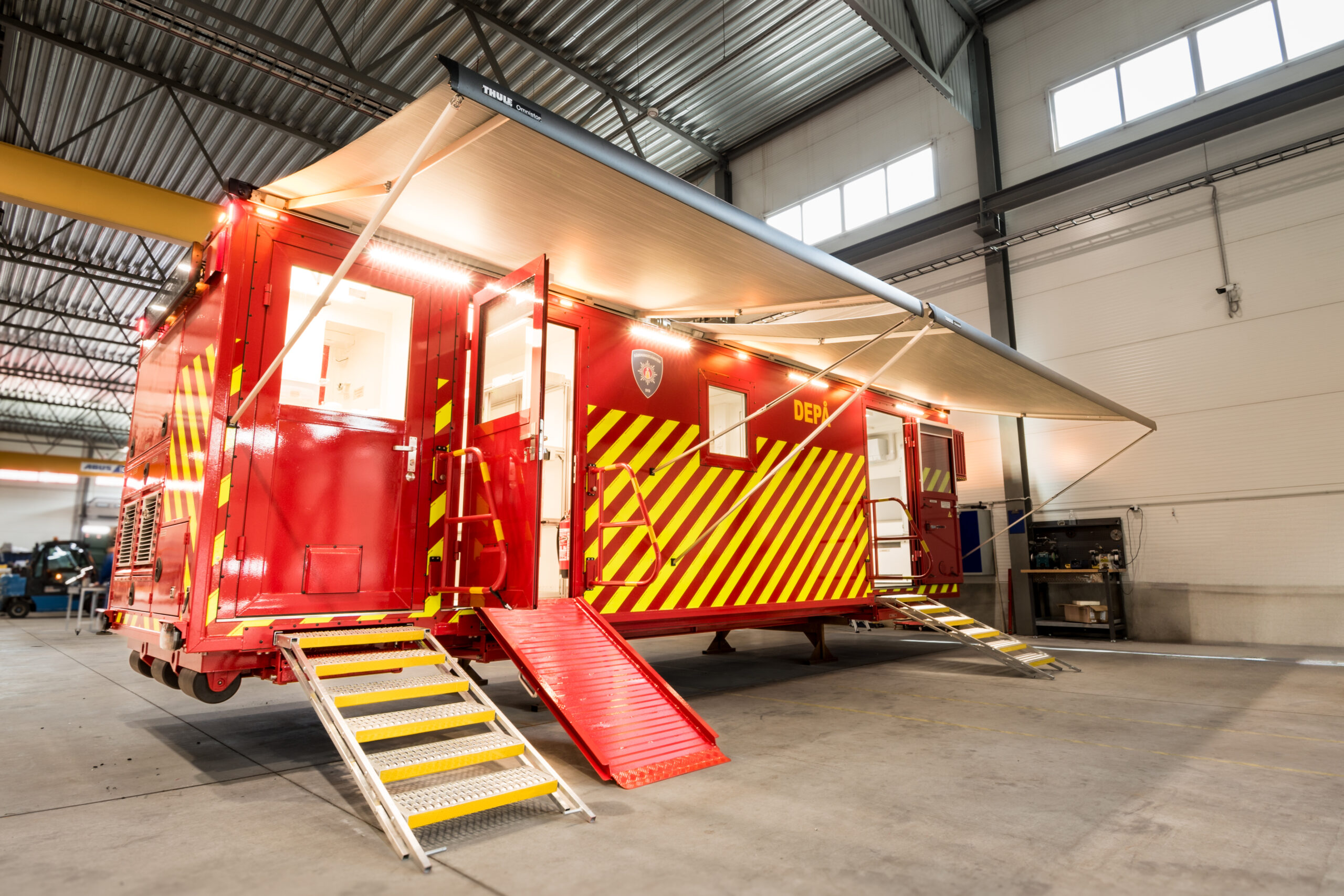 The lightweight shelter is built on a lightweight hooklift frame according to the Swedish SS3021 standard, using high-strength steel combined with insulated sandwich panels and aluminium sheets for enhanced durability and thermal protection. A hydraulic ramp at the rear enables efficient loading and unloading. The shelter integrates a flexible electrical system for field operations, supported by a 24 VDC battery for autonomous deployment and reliable startup. Multiple configurations are available, tailored for rescue services, CBRN incident response, urban search and rescue, and specialized police bomb squads.