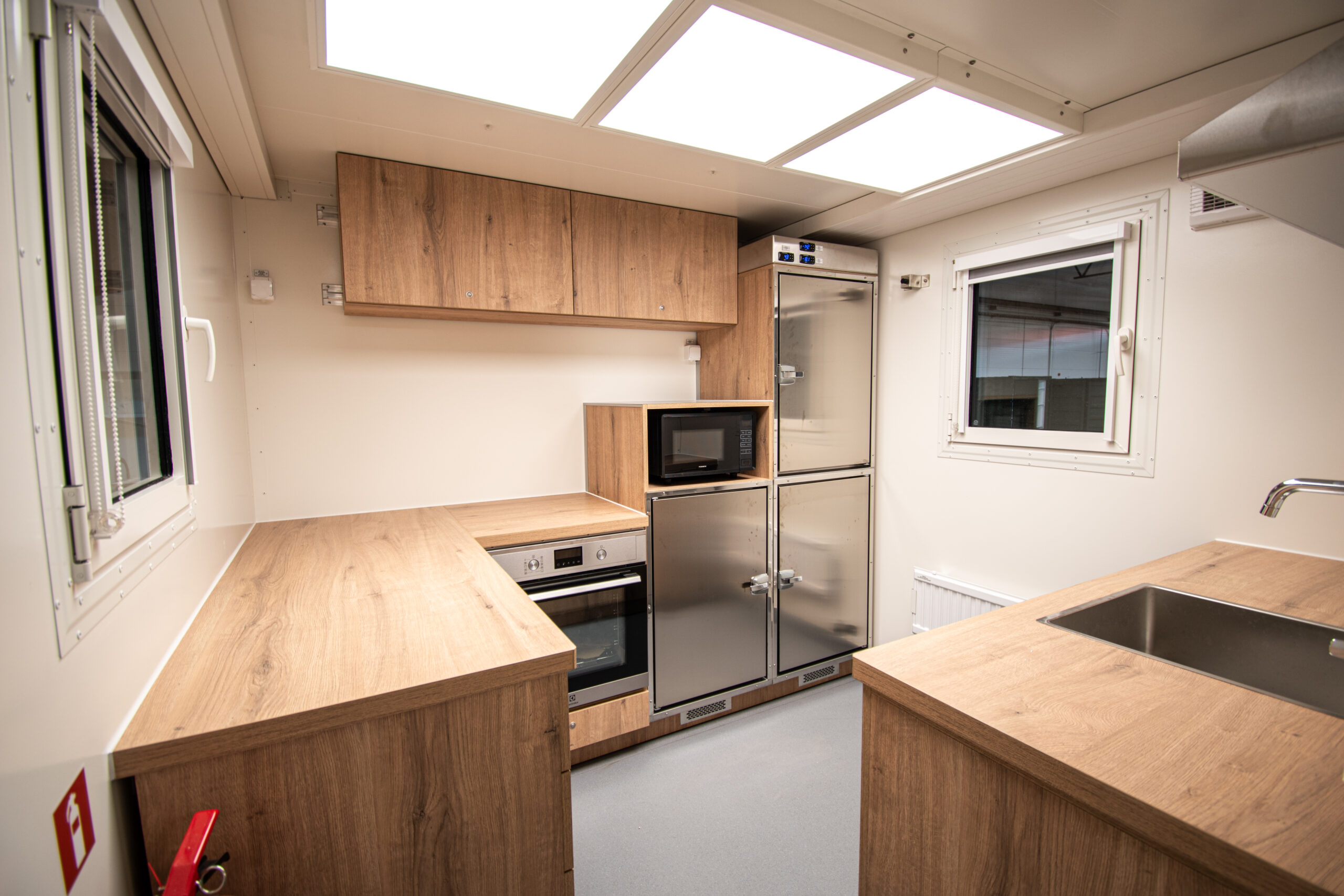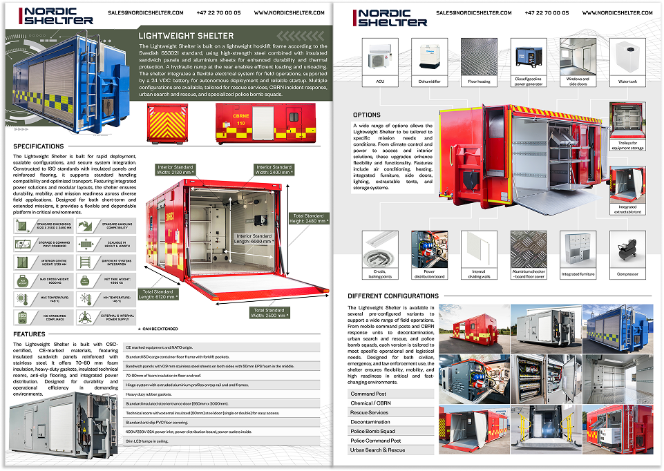 The lightweight shelters is built on a lightweight hooklift frame according to the Swedish SS3021 standard, using high-strength steel combined with insulated sandwich panels and aluminium sheets for enhanced durability and thermal protection. A hydraulic ramp at the rear enables efficient loading and unloading. The shelter integrates a flexible electrical system for field operations, supported by a 24 VDC battery for autonomous deployment and reliable startup. Multiple configurations are available, tailored for rescue services, CBRN incident response, urban search and rescue, and specialized police bomb squads.