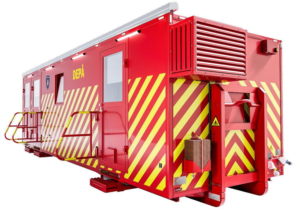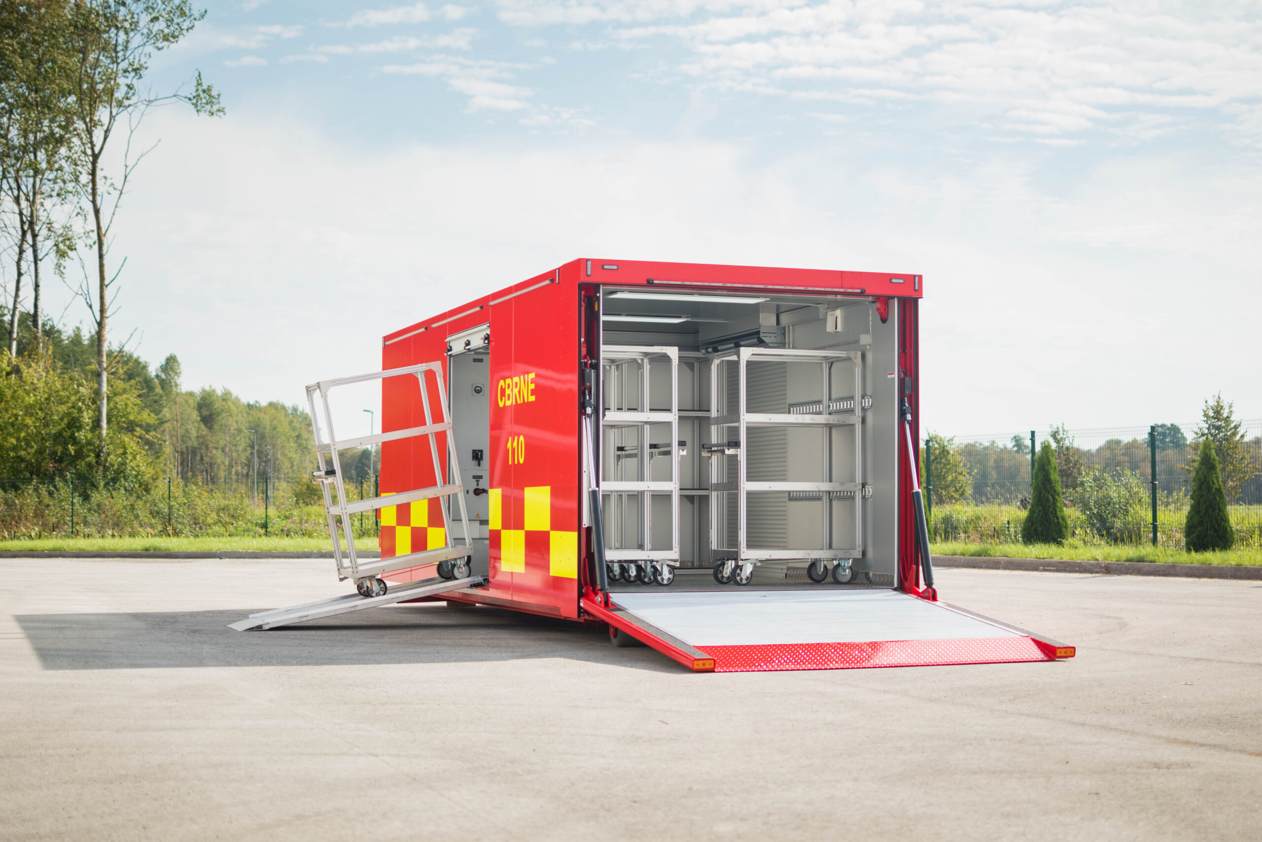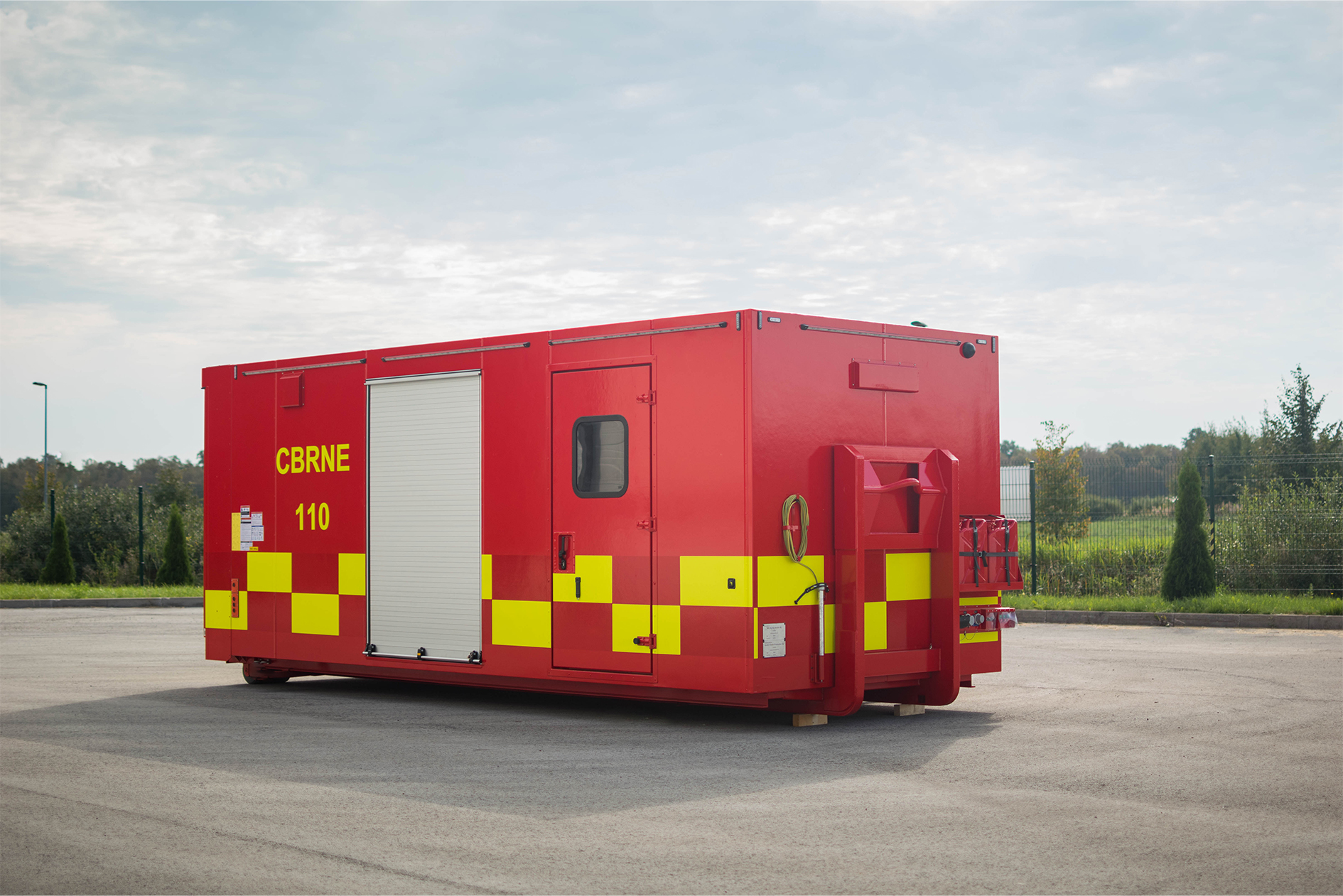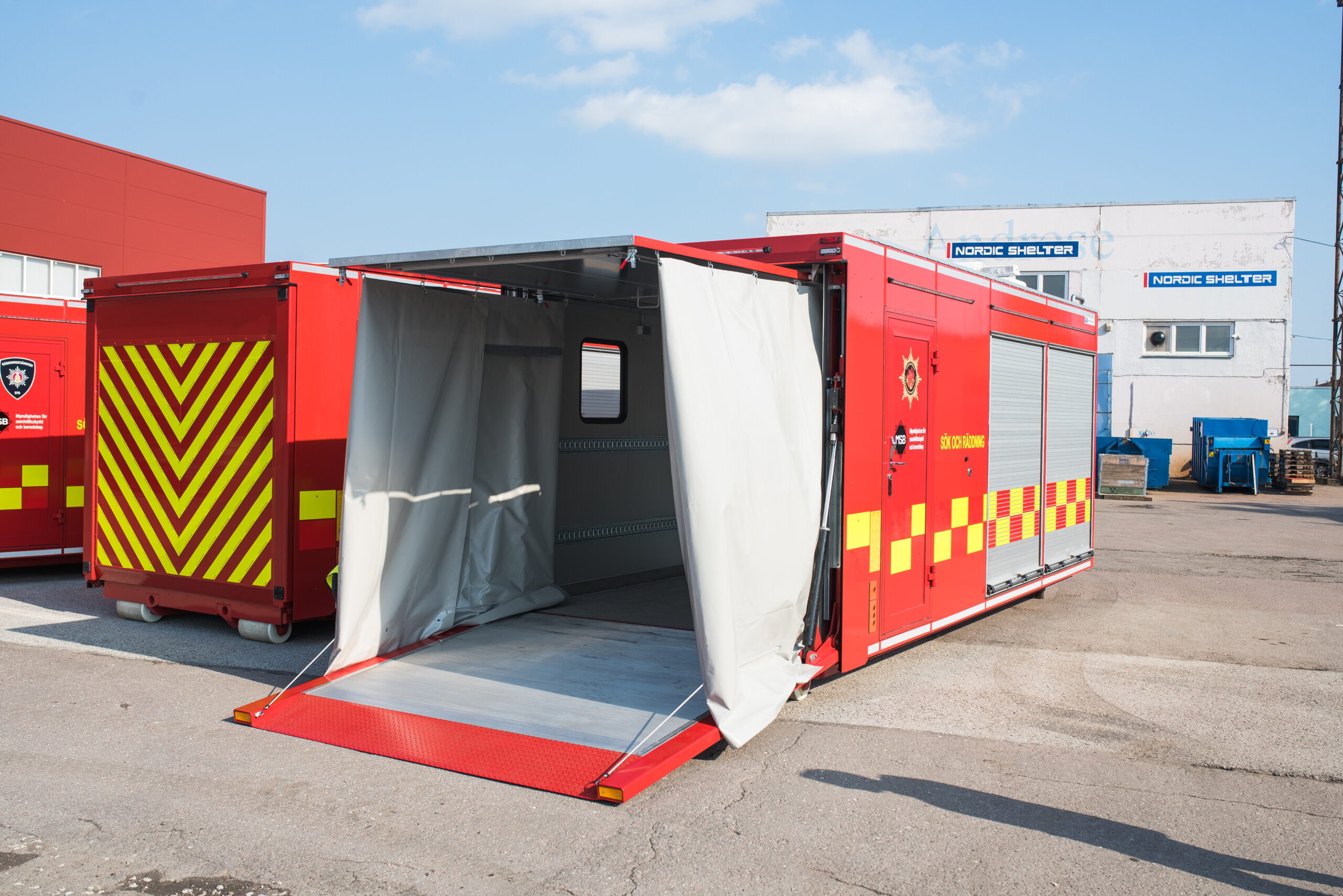 The lightweight shelters is built on a lightweight hooklift frame according to the Swedish SS3021 standard, using high-strength steel combined with insulated sandwich panels and aluminium sheets for enhanced durability and thermal protection. A hydraulic ramp at the rear enables efficient loading and unloading. The shelter integrates a flexible electrical system for field operations, supported by a 24 VDC battery for autonomous deployment and reliable startup. Multiple configurations are available, tailored for rescue services, CBRN incident response, urban search and rescue, and specialized police bomb squads.