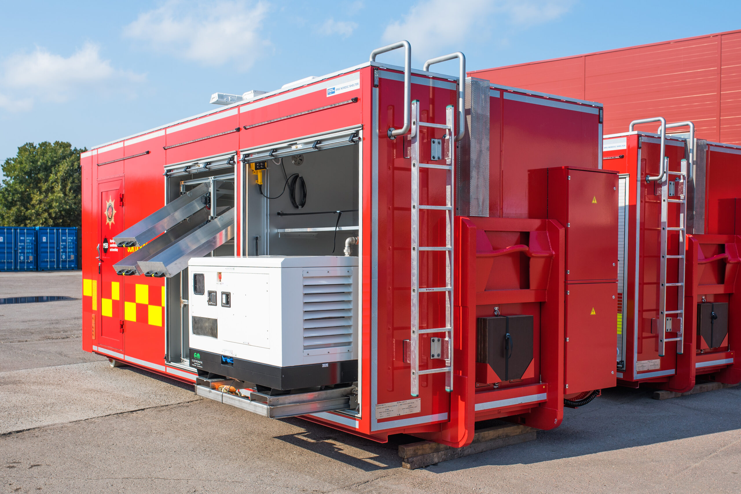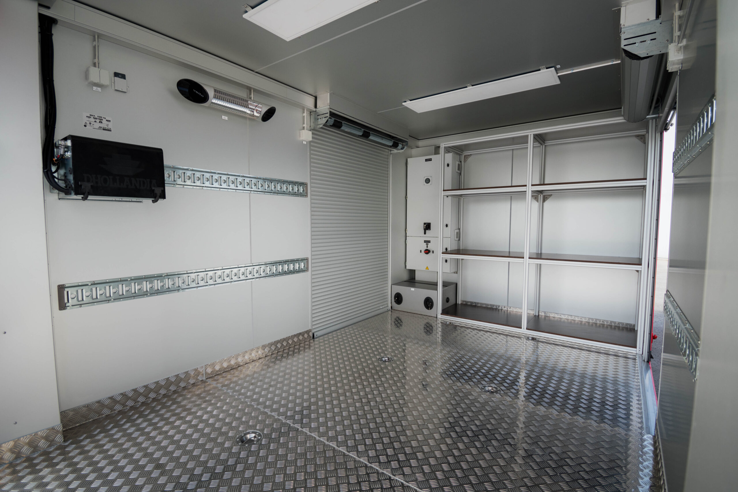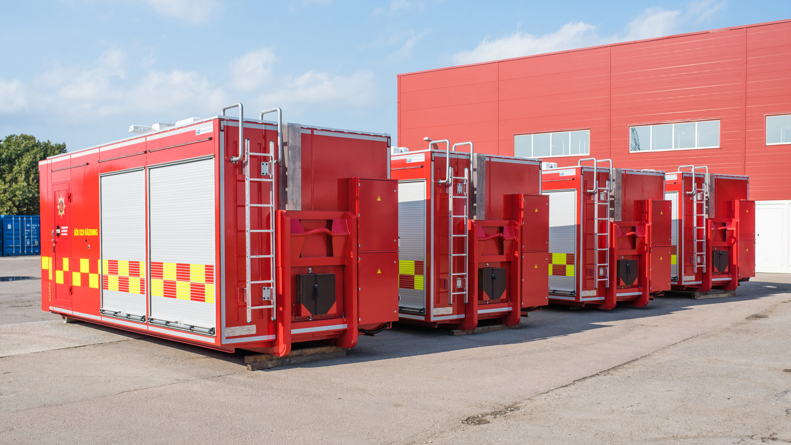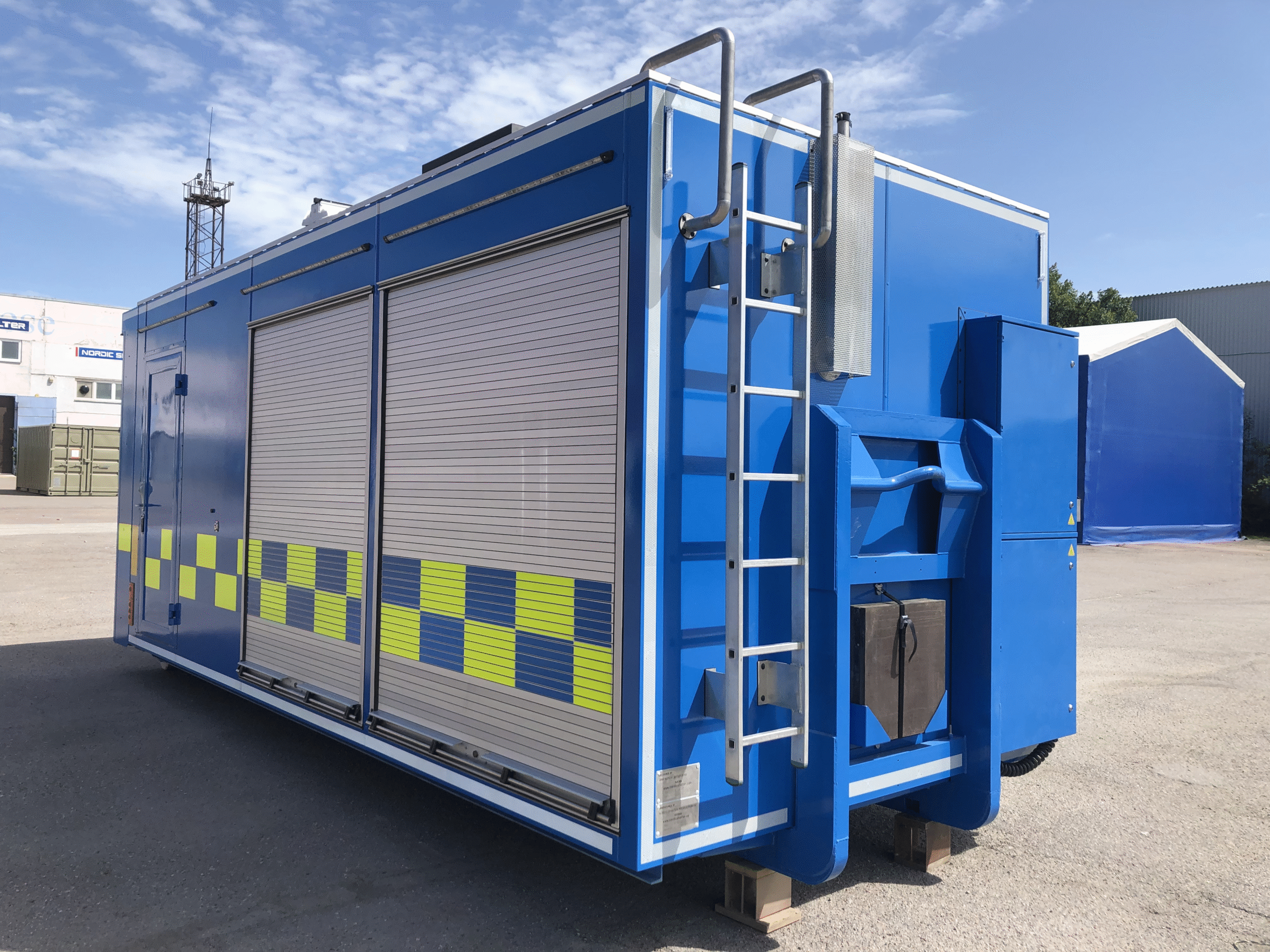 The lightweight shelters is built on a lightweight hooklift frame according to the Swedish SS3021 standard, using high-strength steel combined with insulated sandwich panels and aluminium sheets for enhanced durability and thermal protection. A hydraulic ramp at the rear enables efficient loading and unloading. The shelter integrates a flexible electrical system for field operations, supported by a 24 VDC battery for autonomous deployment and reliable startup. Multiple configurations are available, tailored for rescue services, CBRN incident response, urban search and rescue, and specialized police bomb squads.