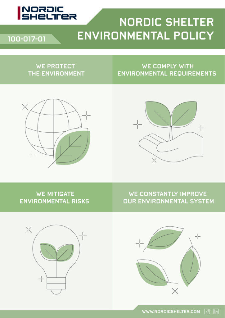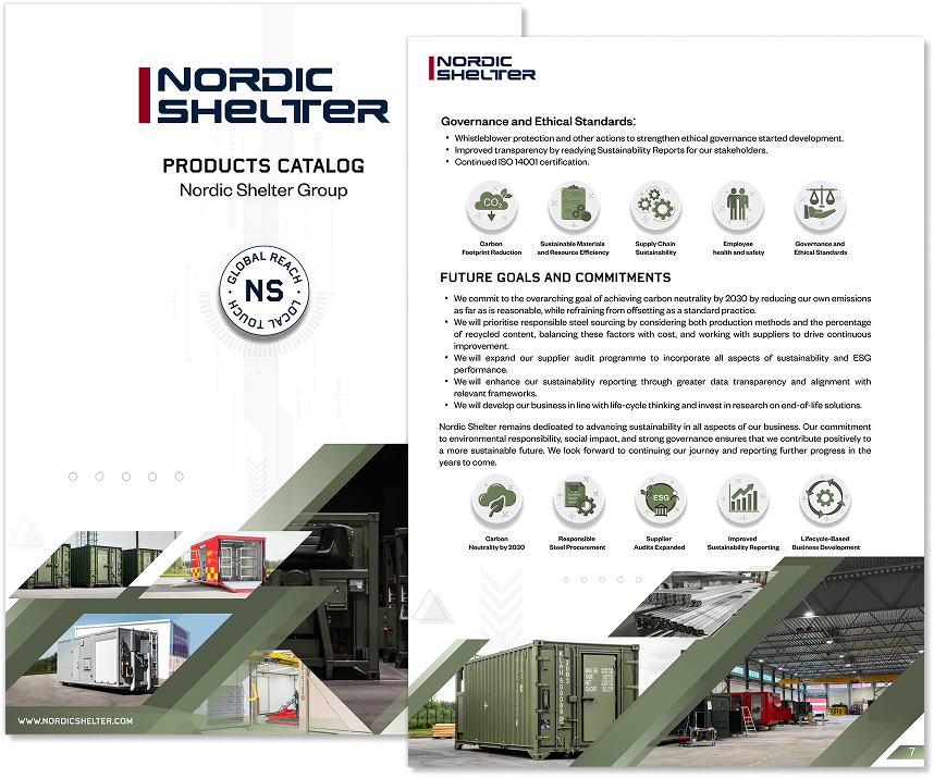 Nordic Shelter is committed to delivering durable, mission-ready solutions with a strong focus on environmental responsibility, social well-being, and transparent governance. Our sustainability efforts follow ISO 9001, ISO 14001, and the ESRS framework to meet the expectations of customers, regulators, and the defence industry. As 2024 marks our first formal Sustainability Report, we have established a clear baseline for measuring our impact. We prioritise reducing carbon emissions, improving resource efficiency, integrating sustainable materials, strengthening supplier responsibility, and enhancing health and safety across all operations. Our goal is to develop innovative, long-lasting products while continuously reducing environmental impact and supporting a more sustainable value chain for the future.