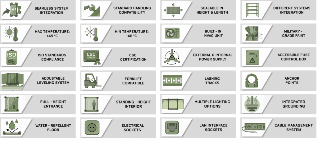 Standard Insulated Shelters come equipped with a wide range of features and integrations designed to enhance overall functionality, adaptability and operational efficiency. In practice, this allows one insulated unit to serve several functions at once, delivering consistently reliable performance across various environments and supporting an expanded, broad operational spectrum of critical needs without requiring any additional structures or additional field equipment for deployment.