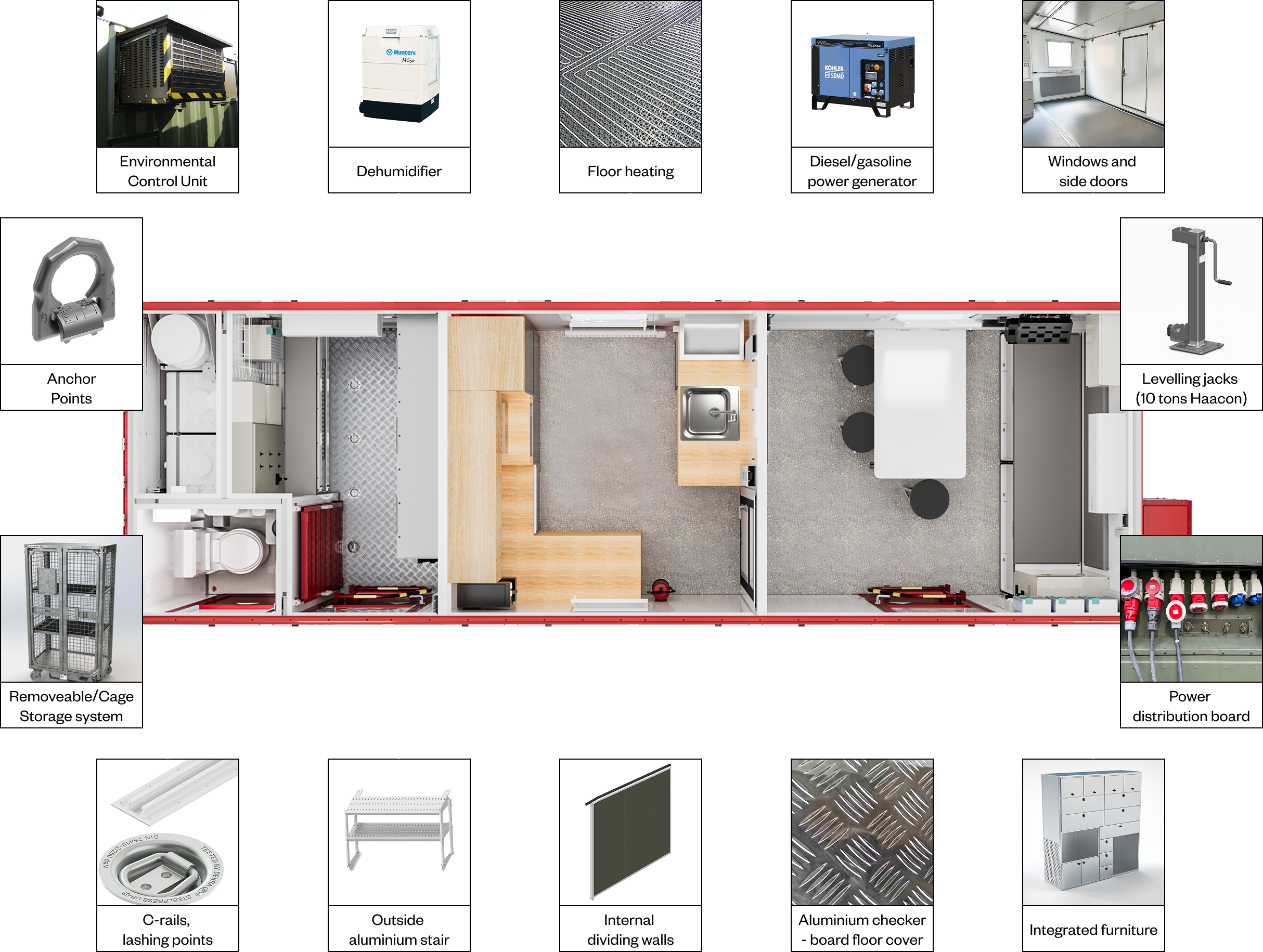 Rotate and zoom to see every angle of its robust structure and expandable design. Experience how the unit transforms from a compact ISO container into a fully operational workspace within minutes. Discover the precision-engineered details, durable materials, and seamless integration of systems that ensure outstanding performance in any climate.