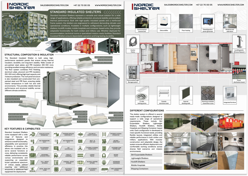 Standard Insulated Shelters represent a versatile and robust solution for a wide range of applications, offering reliable protection, structural stability and excellent thermal performance. Built with high-quality insulated panels and a reinforced frame system, the shelters are engineered to withstand demanding climatic and operational conditions. Available in multiple configurations, such as lightweight shelters, hooklift models, mobile hospitals and container-based units, they provide adaptable functionality for both civilian and military use. Whether deployed for accommodation, technical rooms or specialized mission-ready facilities, Standard Insulated Shelters ensure dependable operation and long-lasting durability.