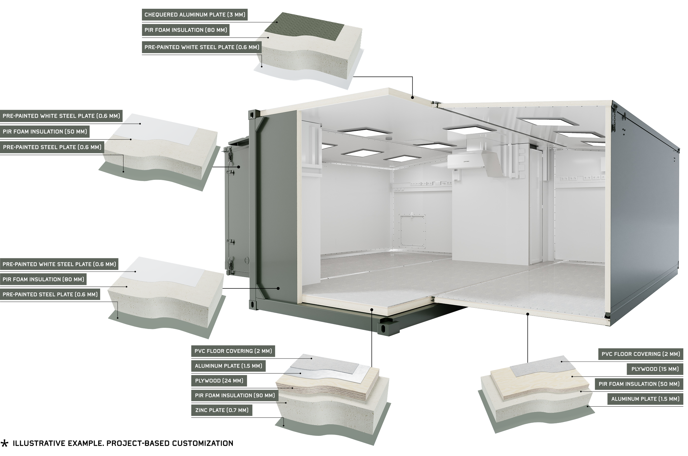 The floor system combines PVC finishing, aluminum plate, plywood and PIR insulation (50–100 mm), offering high load capacity and moisture protection. The roof panel structure is also insulated and constructed from pre-painted steel/aluminium and PIR foam, ensuring stable interior temperature in both hot and cold environments. This provides reliable thermal performance and structural stability across different climate conditions.